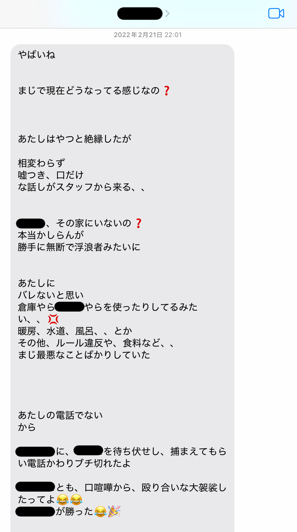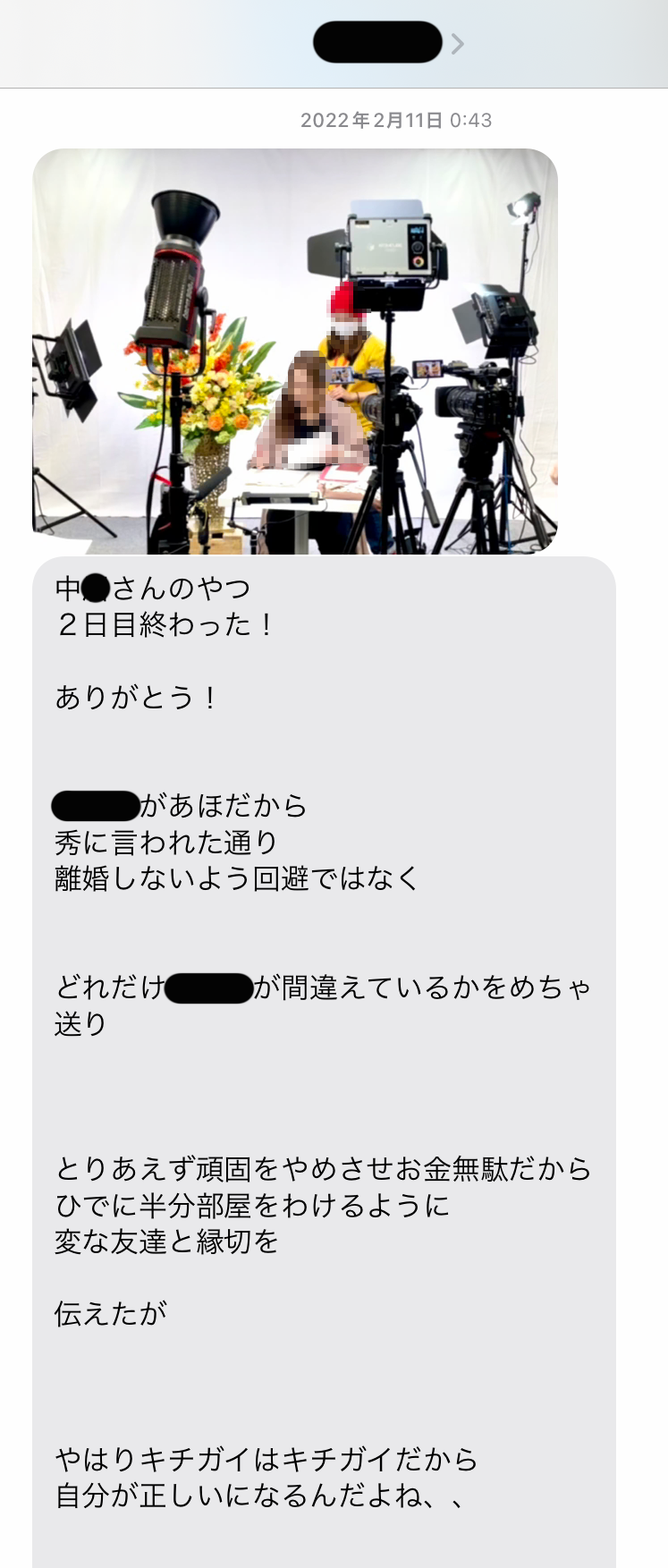 散々お金の話をしておいて、借金額を訊いたら「難しい話はやめにしたい」と言い出す。難しい話か? 仕送り先は自分の息子のカールくんではないのか? 両親へは自分のオーストラリア留学費用を返済しているのではないのか? 月々の借金返済額もわからないのか? 恐ろしいほど金銭感覚がルーズすぎる。そして怖い思いをしているのは私の方だ。まったく話が嚙み合わない。確かに、サイコがそこに寝ていたら殺意を覚えるかもしれない。この日2月7日の夜11時過ぎにサイコは帰ってきた。私はひと言LINEを送った。