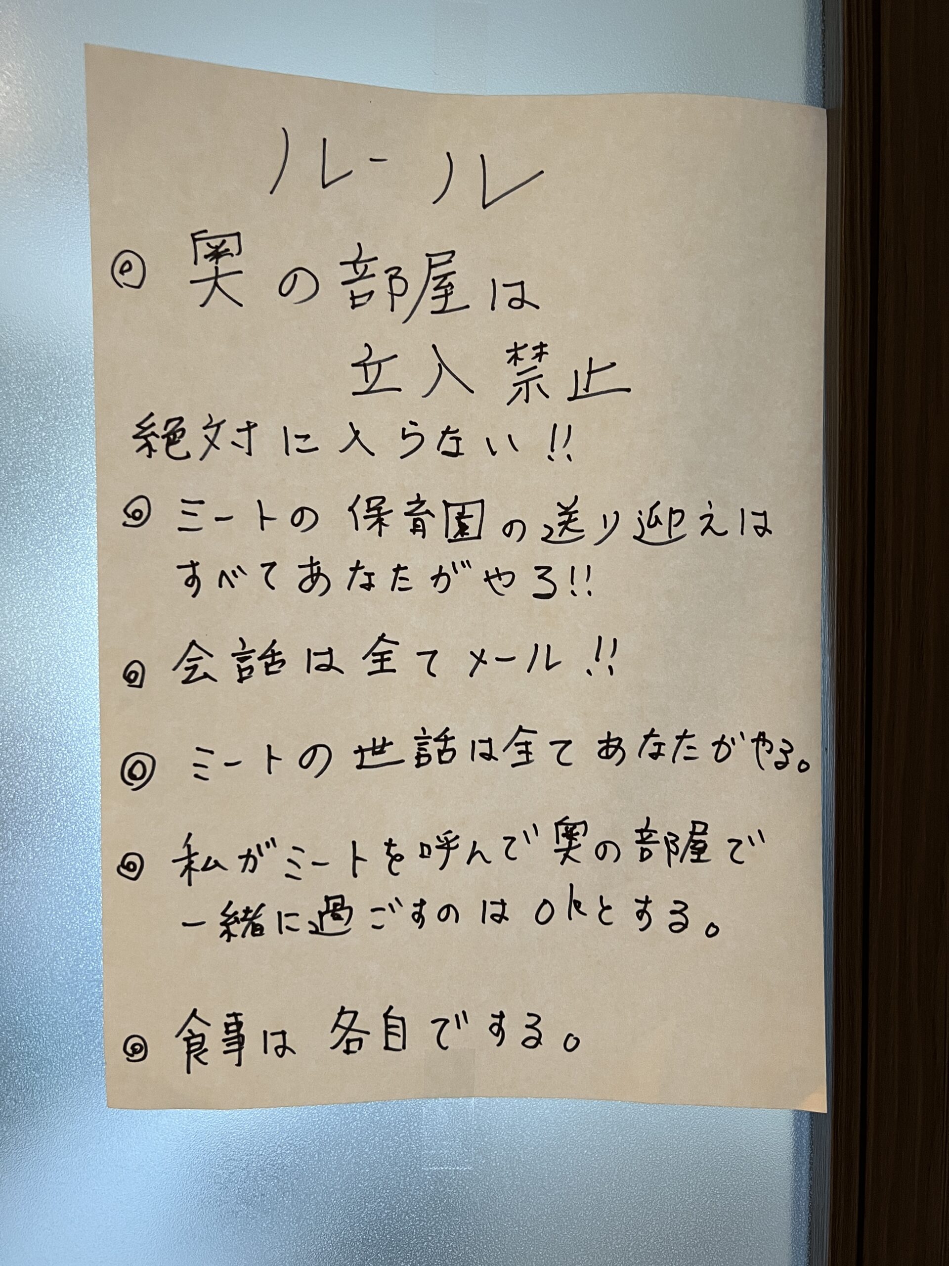 2022年2月7日(月)10泊11日のアパホテル生活を終えて、サイコとみーとくんが暮らす台東区のマンションで、今日から私も一緒に暮らすことになった。このマンションの間取りは、玄関を開けると真っ直ぐ伸びる廊下の左手にバスルームとトイレがあり、その先の左手にキッチンと小さなダイニングがあり、廊下の突き当りがリビングである。そのリビングの扉に張り紙があった。