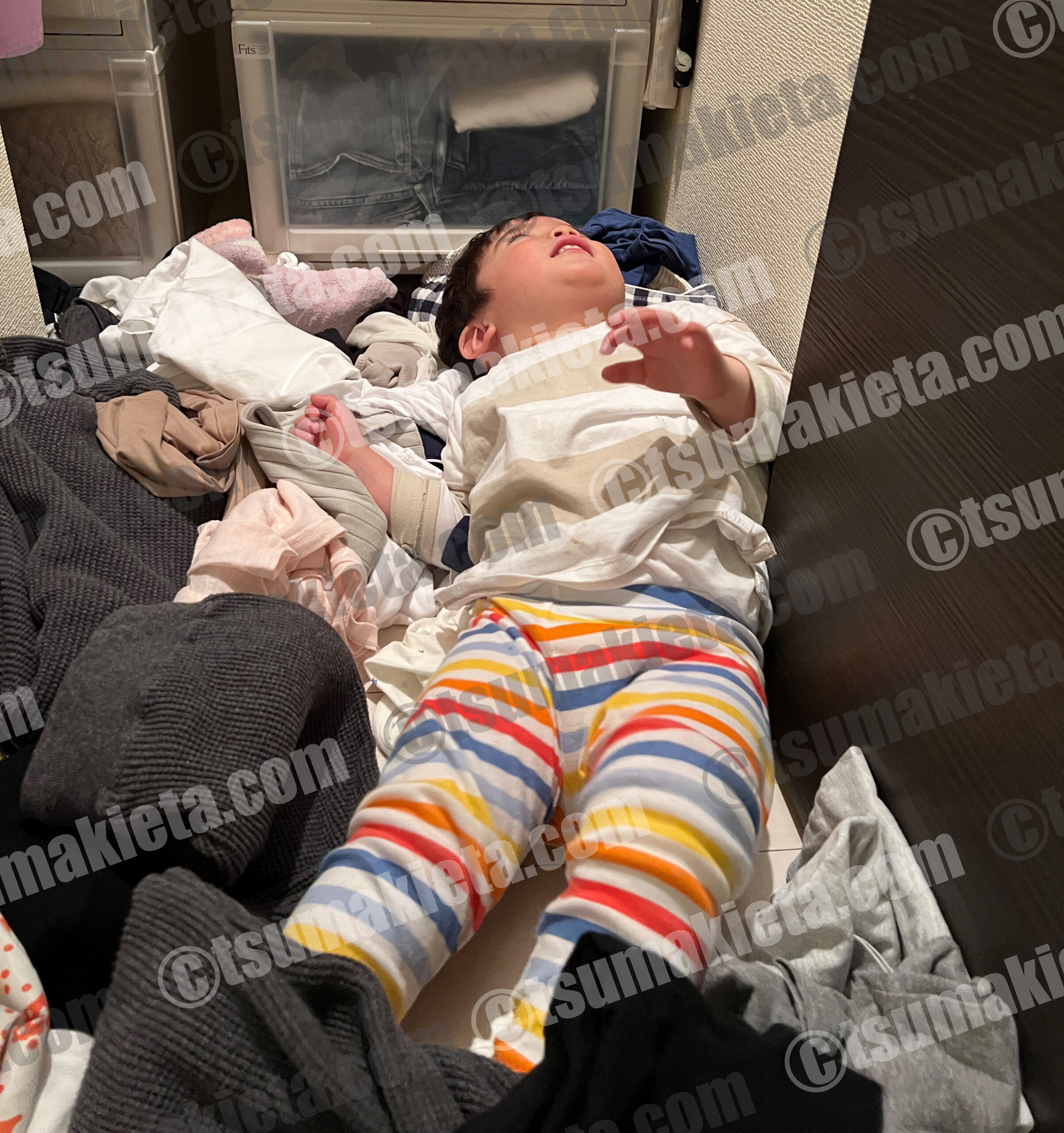 自宅療養期間中クローゼットのママの衣類を散らかして戯れるみーとくん