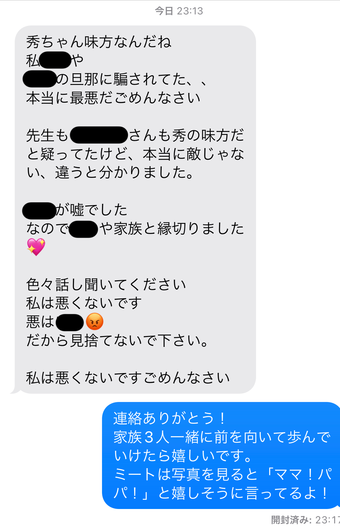1月以来3ヵ月以上口をきいていなかったサイコからのメールは、急に手のひらを返したものだった。占い師スピ子が説明し説得してくれたのだろう。今まで敵だと思っていた私とスピ子とズン子が、実は自分の味方だと理解したようだ。私はサイコの敵ではないが、サイコとはもう離婚しようと考えている味方なので、ギリ味方である。そしてサイコは「妹バリ子とバリ子の旦那に騙されてた」と気づいたようだ。実際に騙されていたのかどうかは定かではないが、「悪はバリ子」だと決めつけている。おそらくスピ子の入れ知恵だろうが、妹とも両親とも縁を切ったようだ。そして「私は悪くない」と何度も何度も主張する。スピ子譲りの“自分理論”炸裂である。呆れるしかない。私はサイコと連絡がついて心の底からホッとした。愛する妻が無事だったという安心感よりも、台東区のマンションに置きっぱなしのサイコの荷物がこれでやっと片付けたられるという安心感からである。