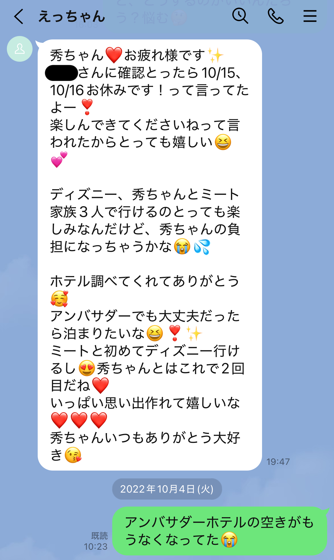 10月15日は妻サイコの誕生日である。1年前の誕生日には自殺未遂事件を起こされた苦い経験があるので、今年の誕生日はちゃんと祝ってあげたい。私はディズニーランドとディズニーシーへ1泊2日で行く計画を立てた。